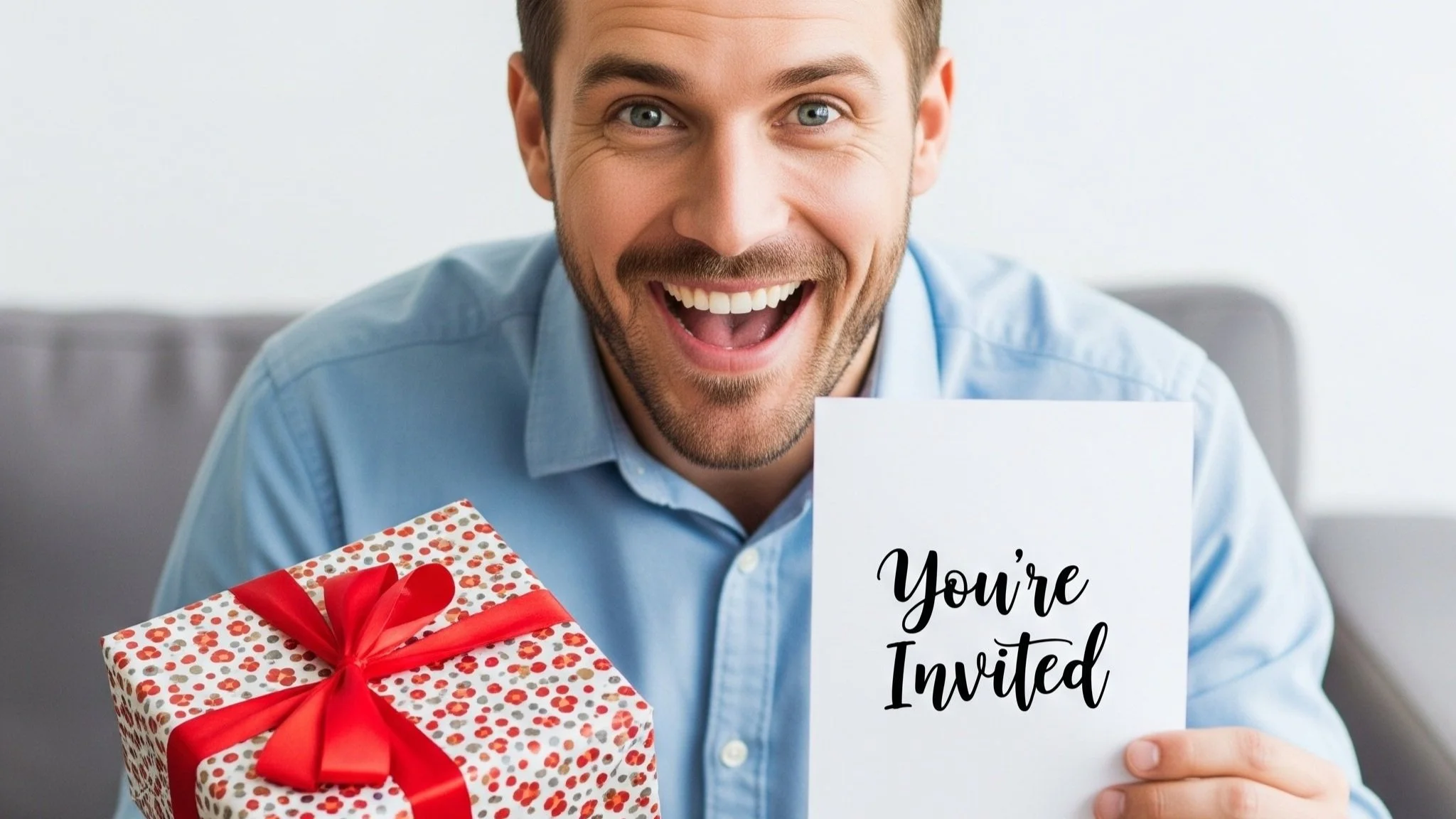 Smiling man holding a wrapped gift and an invitation card that says “You’re Invited,” symbolizing hospitality, celebration, and the power of a personal invitation.